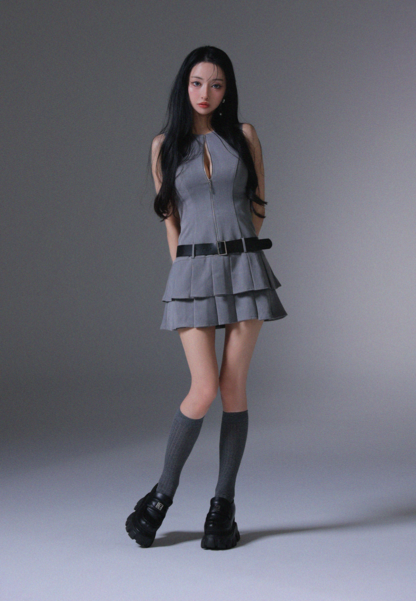 Sleeveless center zip flared mini with belt (GL4307) ¥28,380-