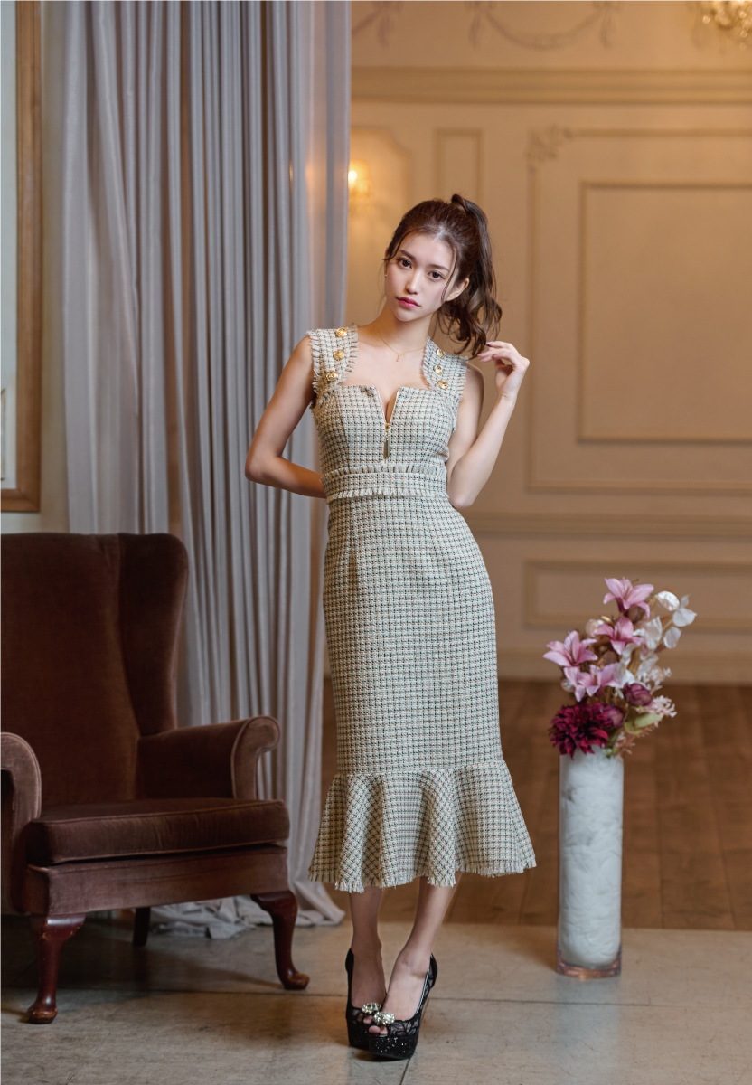 Gold Button x Spring Tweed Long Dress (DE3307) ¥31,680-