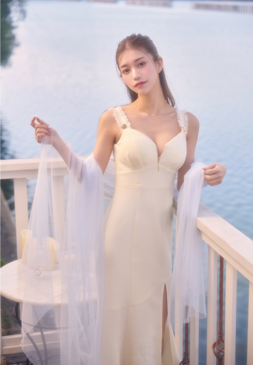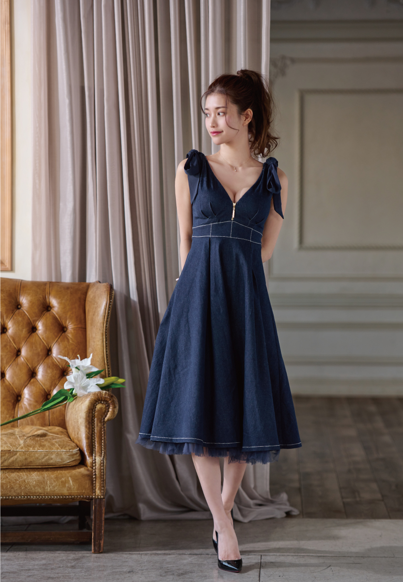 Shoulder Ribbon x Tulle Flare Long Dress (DE2745) ¥28,380-