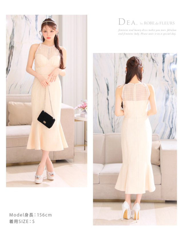 チェック柄レースを使用したマーメイドミディドレス。