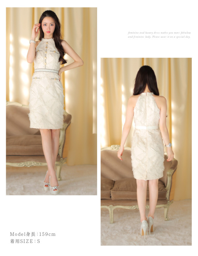 フェミニンなフリンジ生地を使用したアメスリデザインのタイトドレス。