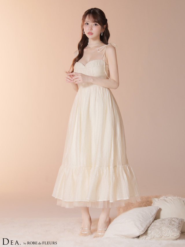 細めのキャミソールストラップとハートカットのバストラインが、女性らしい華奢な印象に。