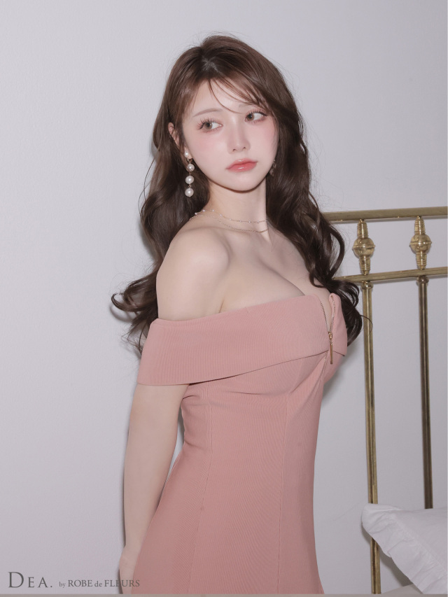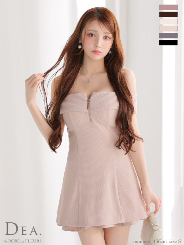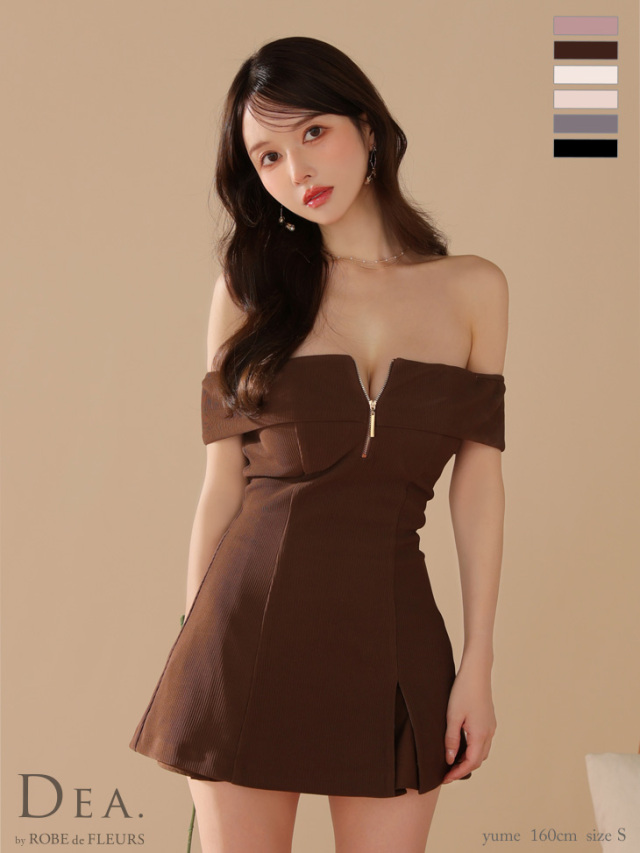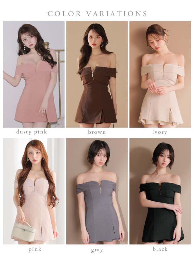 胸元のジップとオフショルダーの絶妙な肌見せで、視線を惹きつける一着。