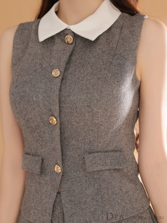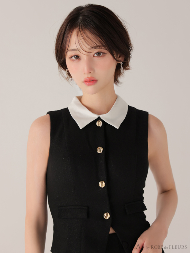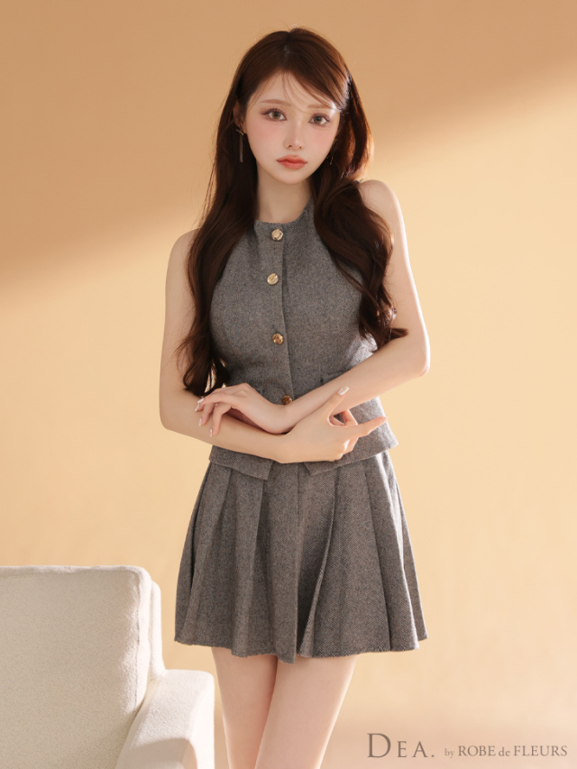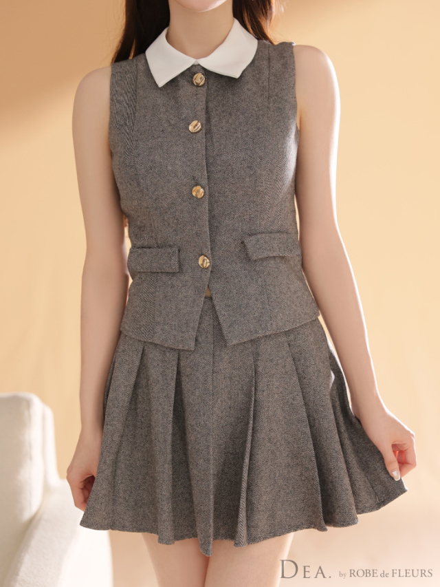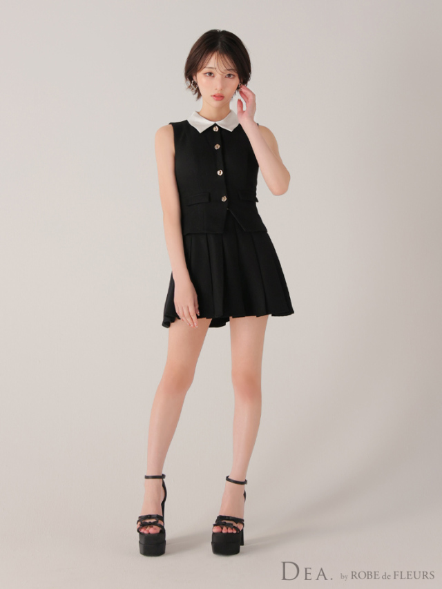 ウエストをすっきり見せるベスト風トップスで大人の可愛さを演出。