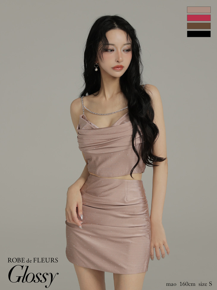 大胆なバストカットとキャミデザイン、短め丈から見えるウエストもポイント。