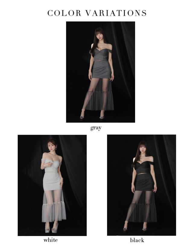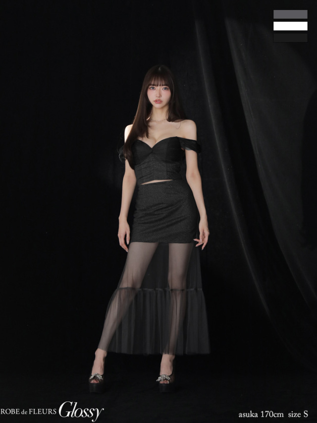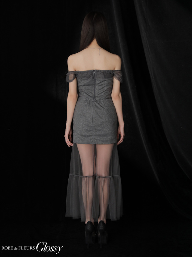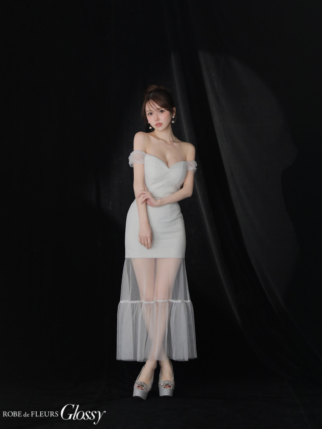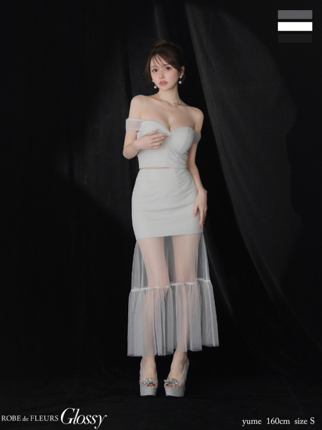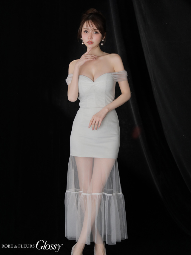 透け感のあるチュールシースルーのロングスカートをドッキングした華やかドレス。