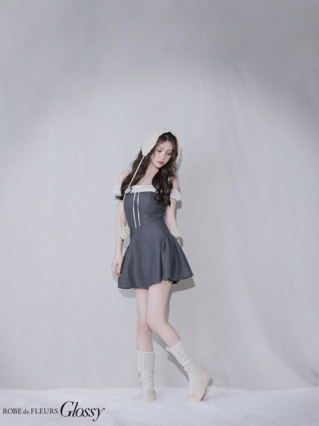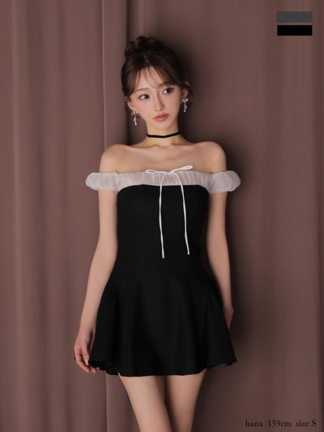 胸元のシフォン素材でフレンチガーリーなオフショルワンピースに仕上げました。
