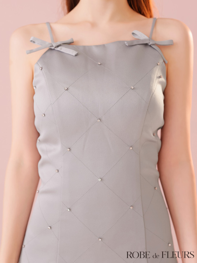艶感のあるサテン生地に、ビジューをちりばめた華やかな一着。