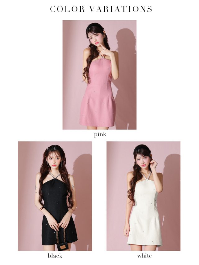 ビジューを散りばめたキュートなミニドレス。