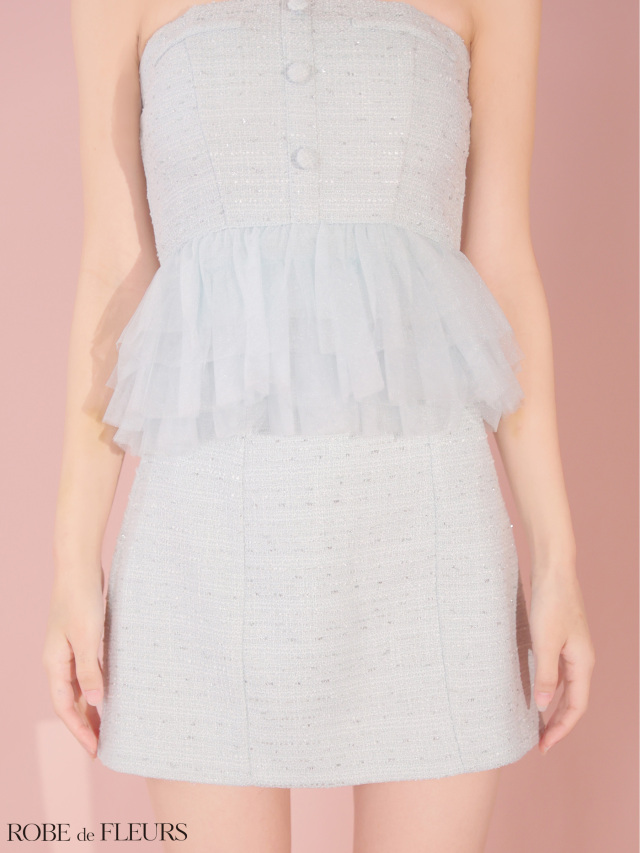 上品で高見えする高級感あふれるツイード素材を使用したベアトップツーピース。